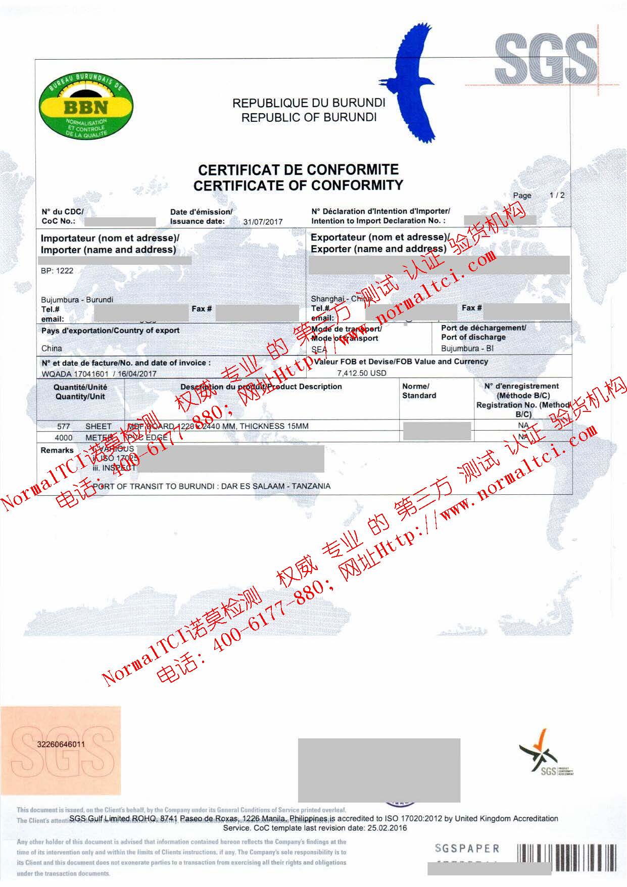 2014年3月15日,布隆迪標準局(Bureau Burundias de Normalisation ,BBN )將實施裝船前符合性評定方案 。此方案需要對所有進口到布隆迪的管控產(chǎn)品進行評定,并出具一張符合性證書(簡稱 CoC )來證明此產(chǎn)品符合適用標準。